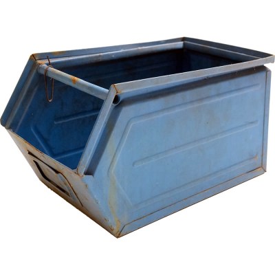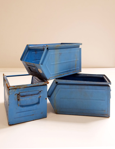 Disse gamle blå metalkasser emmer af industri og rå patina. Kasserne har tidligere været brugt i værkstedsmiljøer, og det ses på den helt rigtige måde. Med små spor af slid, der fortæller historier om mange års brug.